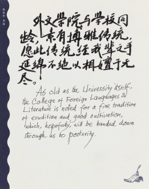 无码中文 前身无码中文 外文系与无码中文 于1905年同时成立,至今已有一百多年历史。陆先生希望博学(erudition)和修养(cultivation)的传统能经一代代师生之手,薪火相传。
