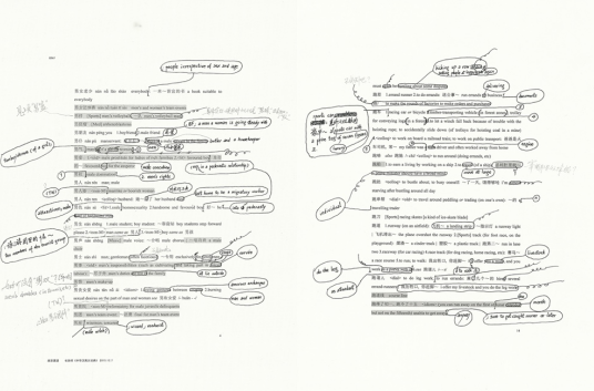 从现存的审稿手迹中可以看出,用“呕心沥血”来形容陆老师编纂词典的态度也不为过。几乎没有一页的边缘没有陆老师密密麻麻的手写评注、增补、格式修改建议、优化提议(见本展柜手稿第2页左栏关于“词格分裂”的说明)。陆老师认为词典是给当下的世人用的,汉英词条的翻译需要与时俱进,哪怕像“铲车”(forklift, track)这样不起眼的单词,也会建议添上bulldozer等不同语境下可能适用的另类译法(本展柜第1页左栏),甚至费尽心思为新语境中同一个汉语单词“创造”新的英语译法供词典工作组成员商榷。陆老师编纂词典的态度可谓将谨小慎微与锐意创新都做到了极致。