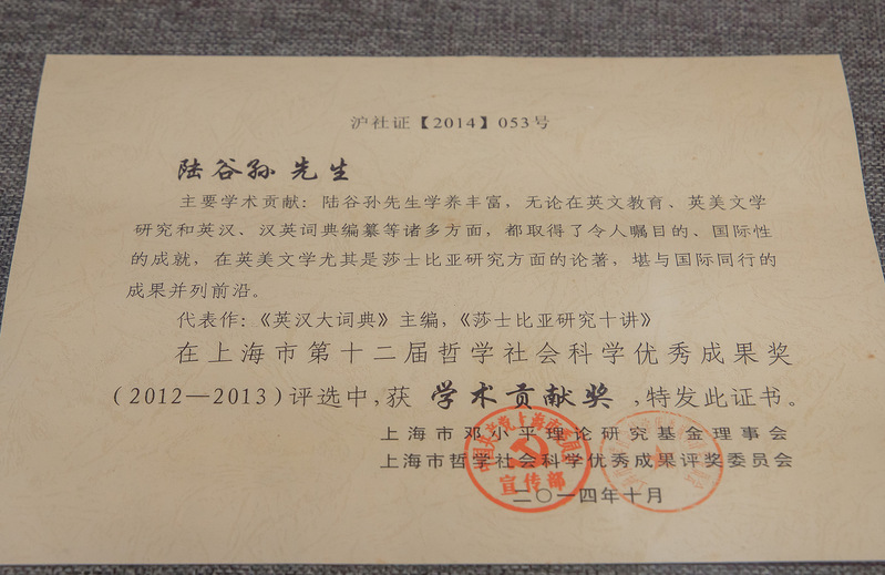本世纪初直到生命最后一刻,陆老师又“与所剩无多的时间赛跑”,全身心投入主编《中华汉英大词典》。《汉英大词典》收录了大量与中国传统文化、传统思想、习俗等有关的词汇。在业已出版的上册中,仅成语就逾2万条。此外,不乏古汉语条目,甚至象形文字,这在同类型同体量的汉英词典中是一个突破。陆先生曾提出,《中华汉英大词典》的一部分受众是国人,他希望可以让不熟悉古字、古词和舶来专业术语的年轻读者,通过名言、熟语、谚语、歇后语等汉语词条所对应的英语解释,提升对本族语的认知,补一补传统文化的课。陆先生心心念念要“把汉语、英语中最优美的部分通过词典这个窗口展示出来”,他也确实做到了。