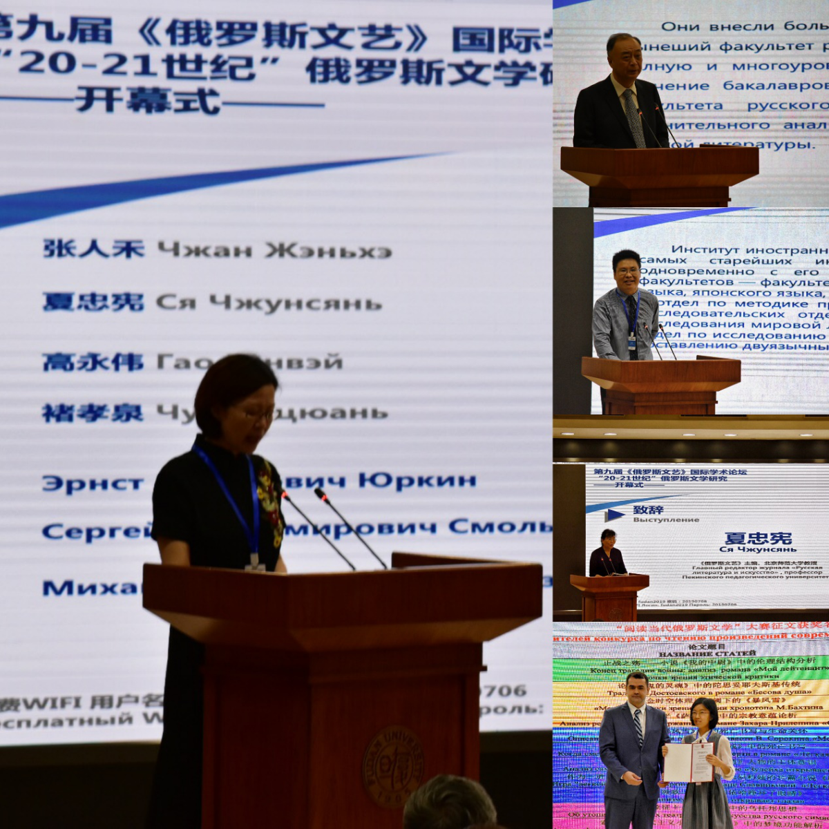 开幕式后,六位国内外顶尖学者和作家依次做大会主旨发言。他们分别是莫斯科大学当代俄罗斯文学教研室主任М. Голубков教授,北京外国语大学张建华教授,俄罗斯高尔基文学院校长兼作家А.Варламов教授,俄罗斯著名当代作家В.Ерофеев, 华东师范大学陈建华教授,俄罗斯侨民基金会研究员Т. Тюрина。六位学者和作家的演讲囊括了20-21世纪俄罗斯文学中的重要问题,其中既涉及近一百多年来俄罗斯文学发展进程的主要规律和特征,也涉及不同的文学流派和思潮,还涉及书写主题和研究现状。