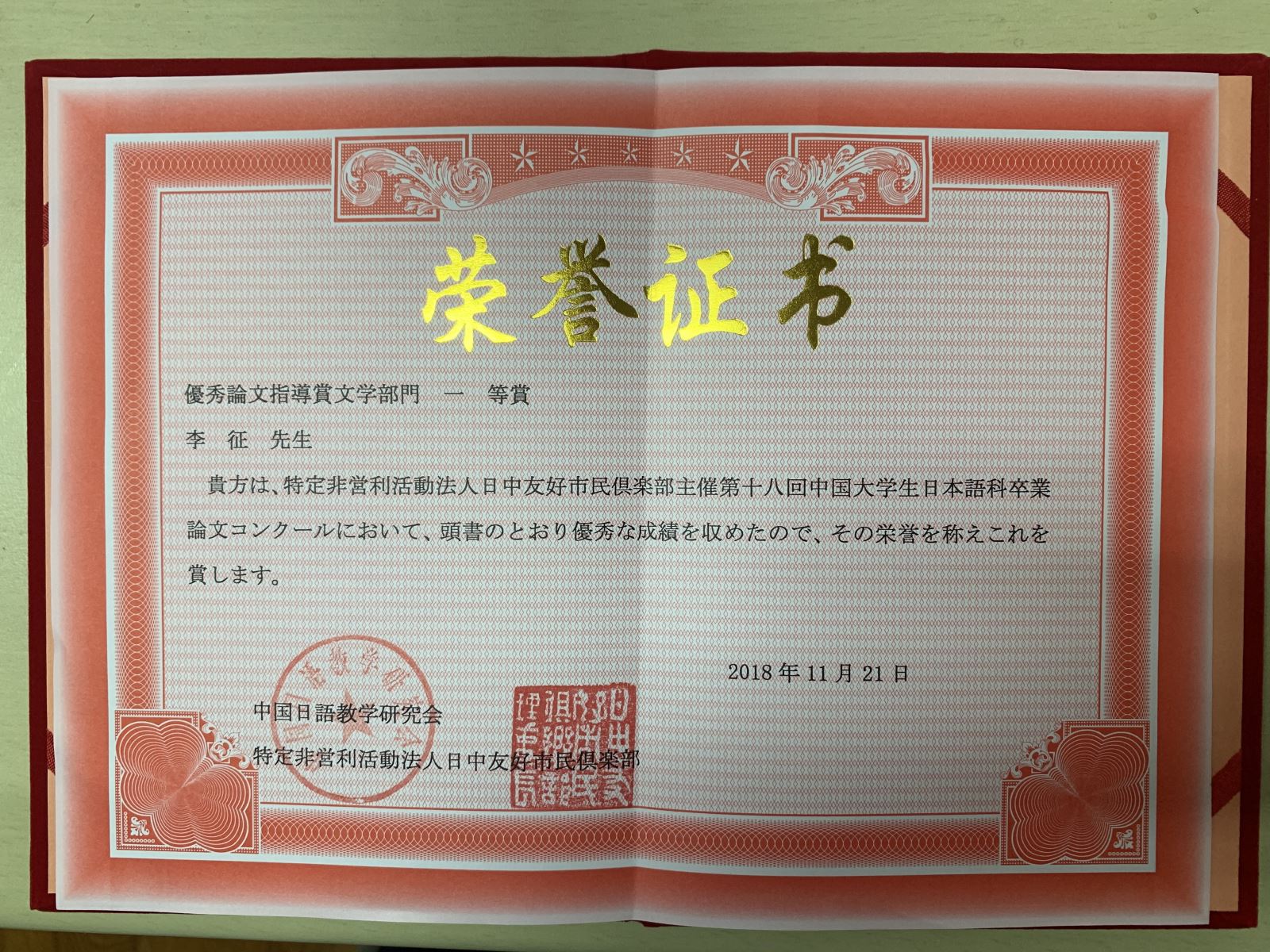 无码中文 日文系连续五年参赛并在三个组别获奖,共计获得三次一等奖、两次二等奖。艾菁老师、杨晓敏老师、李征老师分别获得2015、2016、2018年度优秀论文指导奖。