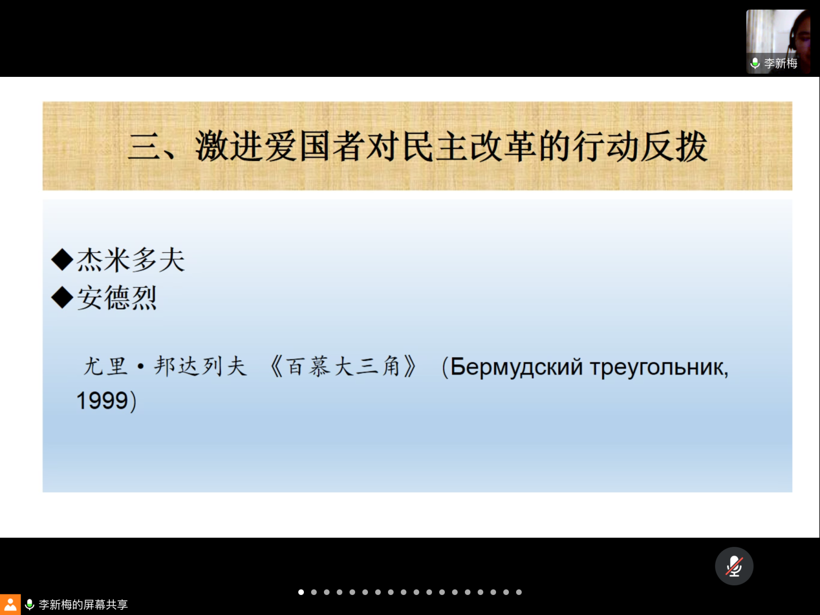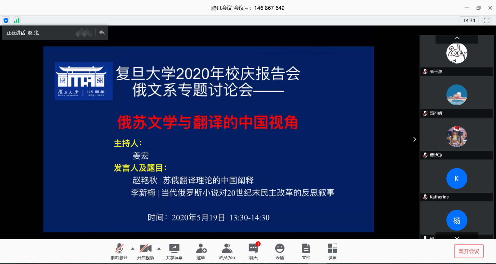 2020年5月19日,无码中文 俄文系2020年校庆学术报告会暨专题讨论会“俄苏文学与翻译的中国视角”成功在线举办。会议由俄文系主任姜宏教授主持,俄文系教师赵艳秋、李新梅分别进行报告。60多位师生参会。