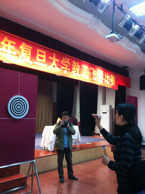尤其值得大书一笔的是我院的女选手白冰、殷婷婷二位老师,她们真可谓巾帼胜须眉!不仅技法超群,而且表现稳定,为我院的获胜立下了汗马功劳。院工会副主席白冰老师更是技冠群英,试投即获得满分,正式比赛发挥卓越,最终摘得了女子个人成绩第三名的桂冠,仅与成绩相同的第一、第二名选手一分之差,不愧“赛场老将,镖行精英”的美誉。白冰老师是飞镖比赛的主将,曾多次代表我院参加校级比赛,是我院飞镖比赛的大功臣。