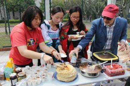 这边英语展台的“我是歌手”引来几位跃跃欲试的“好声音”一亮歌喉;法语展台的填词游戏引得同学们绞尽脑汁,猜得津津有味;韩语展台的问答吸引着外文韩粉的争先恐后;那边俄语展台的游戏组合前排起了长龙,俄国外教带来的自制俄风小吃更是勾的人垂涎欲滴;日语展台一播动漫原声,就激起了日漫迷无可阻挡的热情,未几时日语展台前便围了一群忠实粉丝;德语展台也带来了德国啤酒等一系列德国美食,更有文化常识Q&A令同学们长了不少见闻。