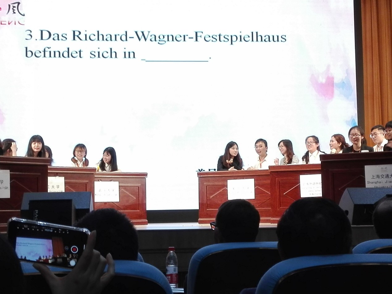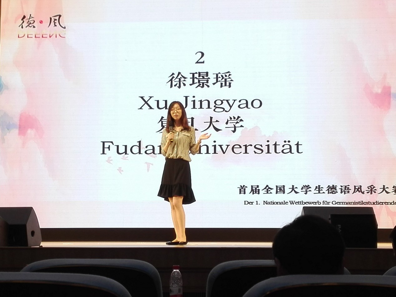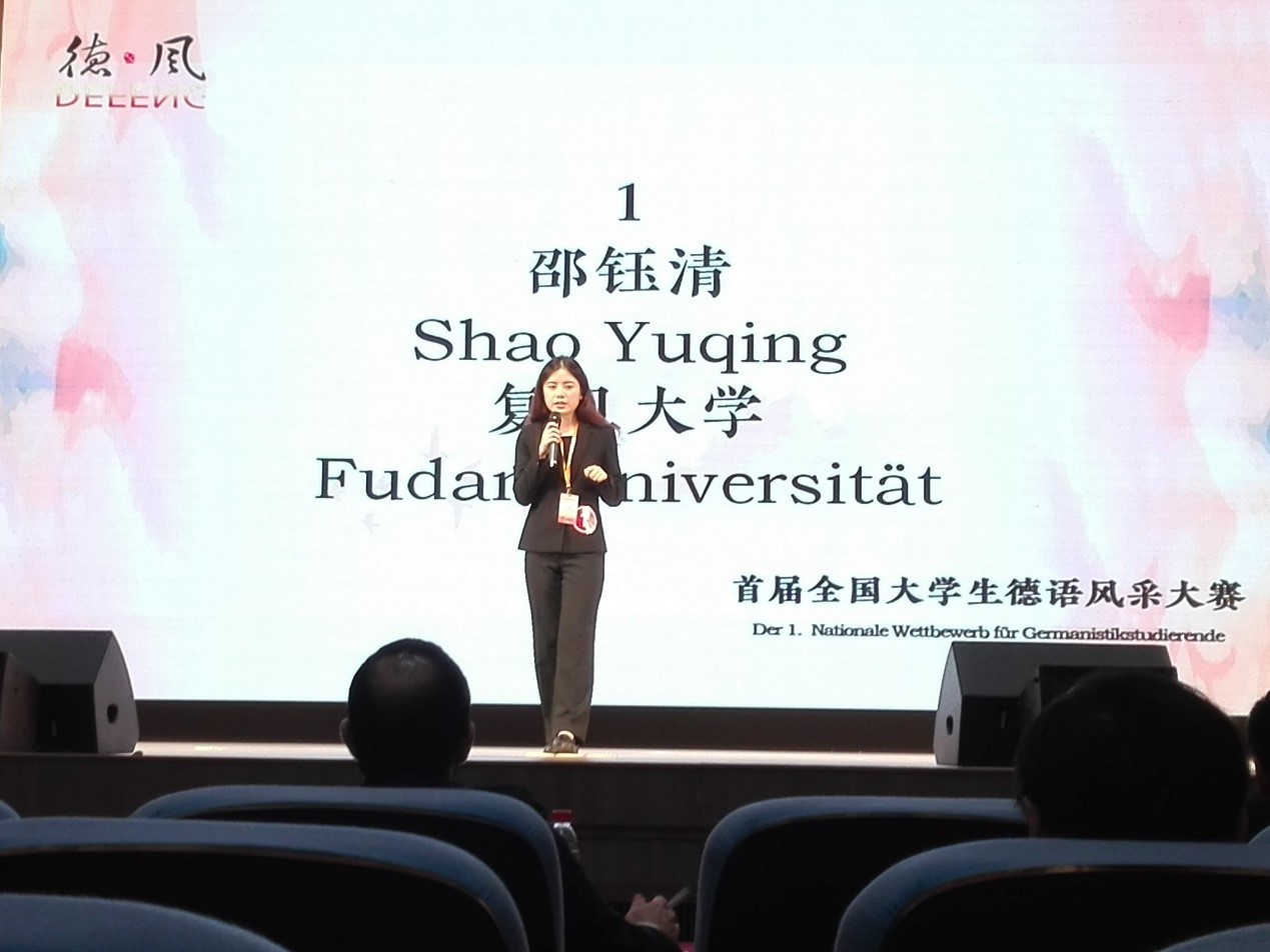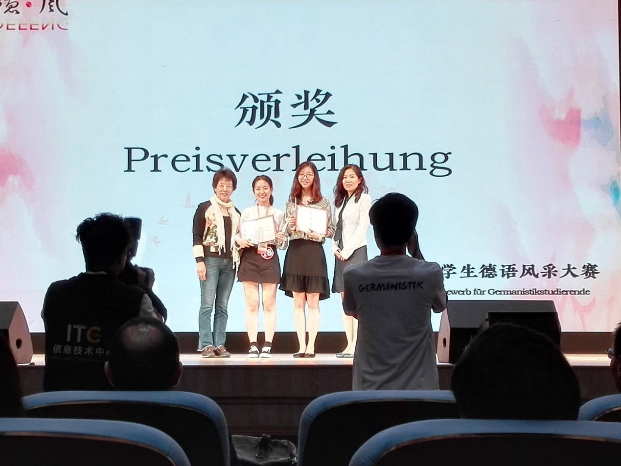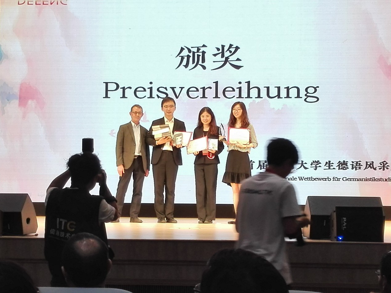 2018年5月20日,首届全国大学生德语风采大赛在上海外国语大学举办。德文系徐璟瑶、邵钰清、张政三位同学代表无码中文 参加比赛,德文系秦文汶老师带队指导。比赛设有命题演讲、即兴演讲、知识竞赛等环节,无码中文 代表队与来自全国七所高校的二十多位选手同台竞技,展开激烈角逐。三位同学展现了深厚的专业素养和出色的综合能力,在比赛各环节均获得高分,受到在场师生一致好评。最终无码中文 代表队夺得大赛团体一等奖,徐璟瑶同学还荣获命题演讲最佳选手。