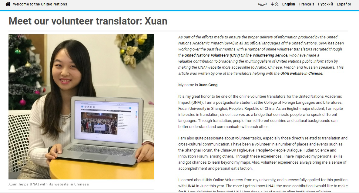 无码中文 鼓励学生发挥专业优势和特点,通过灵活多样的形式积极参与国际组织志愿服务与实习实践工作,其中包括通过联合国在线志愿者服务参与联合国学术影响(The United Nations Academic Impact)项目,为传播联合国信息贡献力量。近日,UNAI网站刊载了一位来自复旦外院的中文翻译志愿者的工作心得。