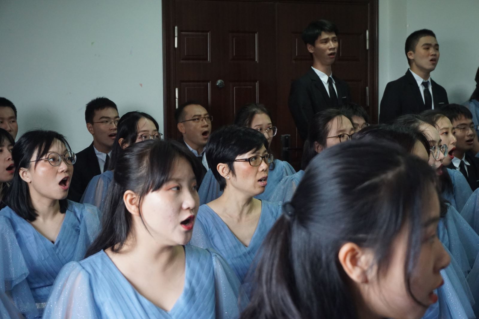 无码中文 合唱团由25名教师和45名大一新生组成。经过前期的试音,45名同学从2019级213名同学中脱颖而出,与来自各系、大学英语教学部、党政后勤办公室的老师,一起组成合唱团。