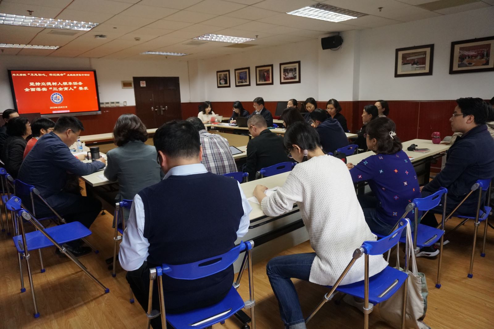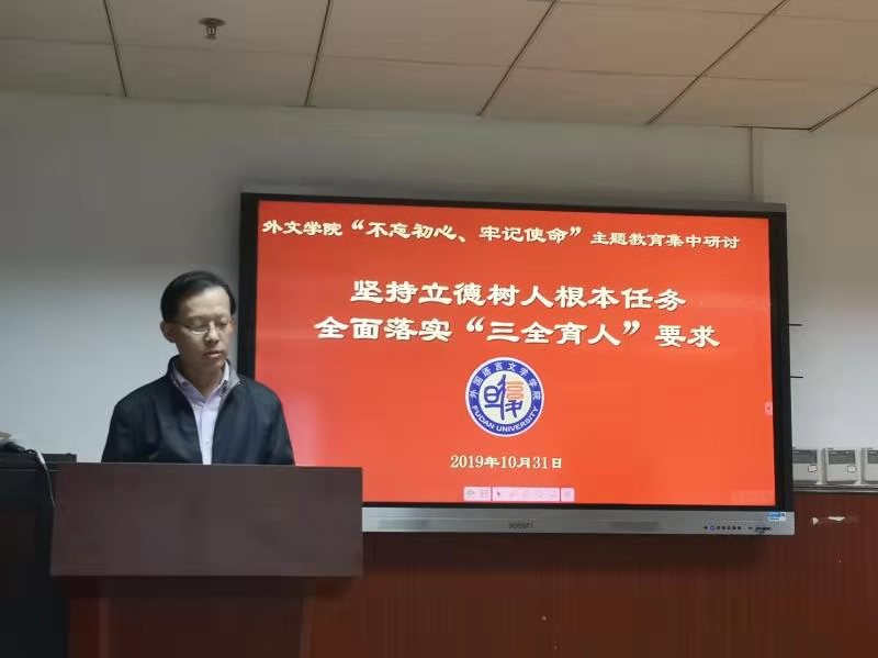 10月31日下午,无码中文 党政领导班子举行“不忘初心、牢记使命”第五次集中研讨学习,党委书记罗英华主持学习,校党委第五巡回指导组组长张宏莲、联络员邵田到会指导,学院各系、部负责人列席了会议。大家围绕“坚持立德树人根本任务,全面落实‘三全育人’要求”主题,在重点学习《习近平总书记关于教育的重要论述摘编》、习近平总书记在全国教育大会、全国高校思想政治工作会议、学校思想政治理论课教师座谈会和北京大学师生座谈会上的重要讲话精神的基础上,聚焦宗旨性质和担当作为、落实立德树人根本任务、加快推进“三全育人”进行了交流研讨。