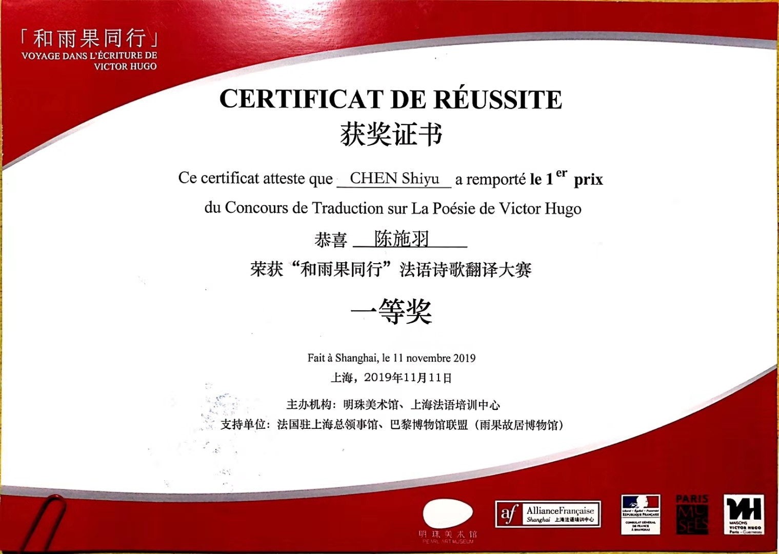 2019年11月11日,“和雨果同行”诗歌翻译大赛颁奖典礼在上海明珠美术馆·心厅隆重举行。经过层层选拔,复旦无码中文 法文系本科三年级学生陈施羽同学在众多参赛选手中脱颖而出,成功荣获诗歌翻译大赛第一名,并在颁奖礼上朗读自己的译文,与在场的观众和获奖选手们共同感受诗歌语言的魅力。