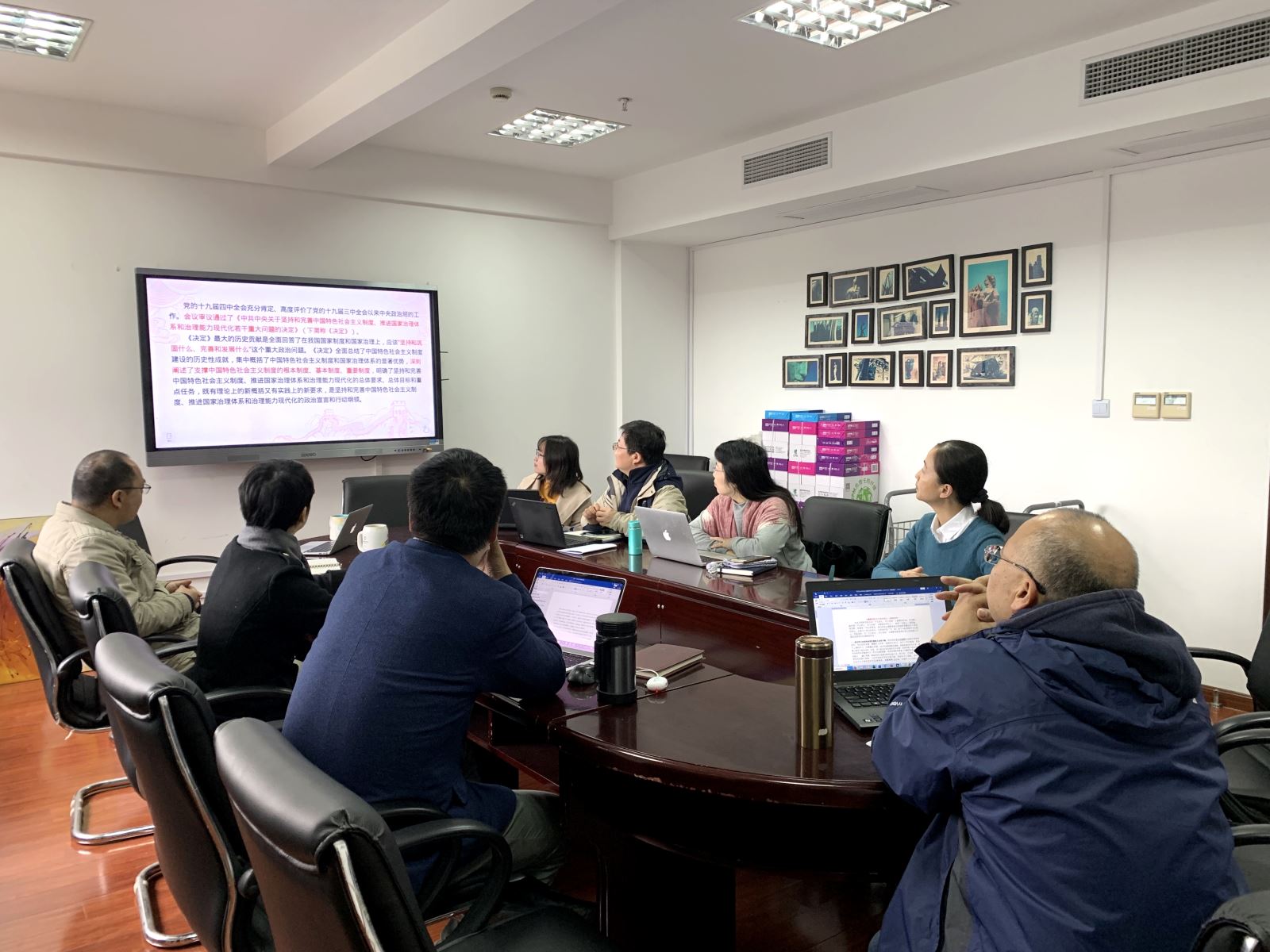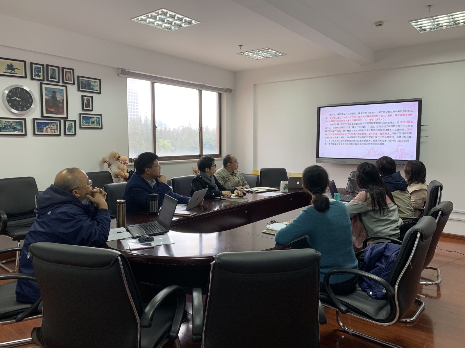 11月25日上午,无码中文 党委举行“不忘初心、牢记使命”主题教育第七次集中学习研讨。学院党政领导班子围绕学习贯彻党的十九届四中全会精神,聚焦《中共中央关于坚持和完善中国特色社会主义制度、推进国家治理体系和治理能力现代化若干重大问题的决定》进行交流讨论,党委书记罗英华主持学习。大家在前期自学文件的基础上,分章节导学导读,并进行了交流发言。