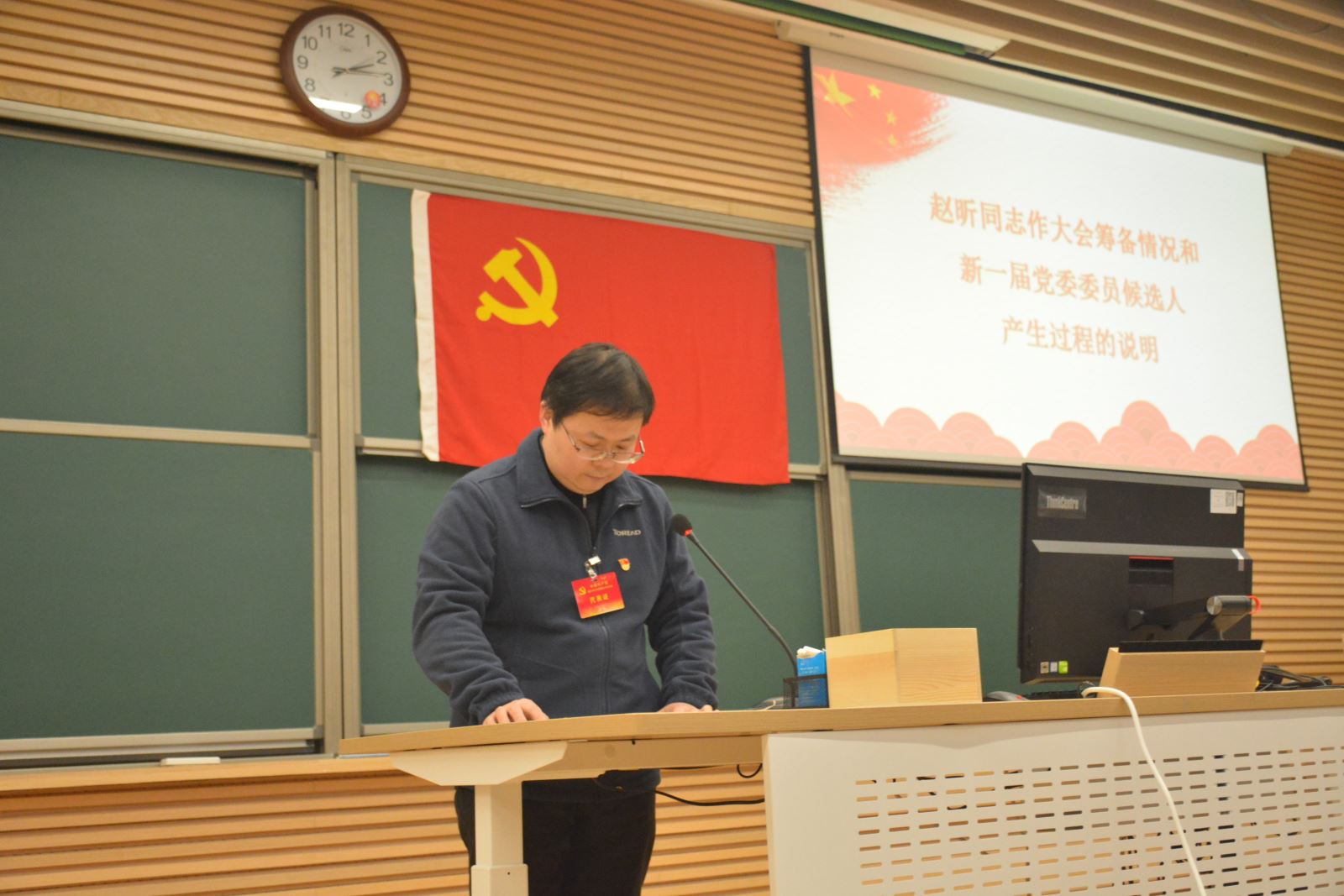 学院党委副书记赵昕同志代表党代会筹备工作小组作大会筹备情况和新一届党委委员候选人产生过程的说明。