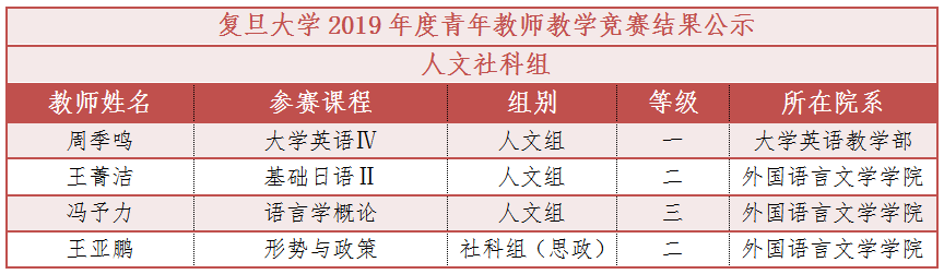 在无码中文 2019年度青年教师教学竞赛中,我院大英部周季鸣老师摘得人文组一等奖,日文系王菁洁老师、英文系冯予力老师和学工办王亚鹏老师分别获得人文组和社科组(思政)二、三等奖。