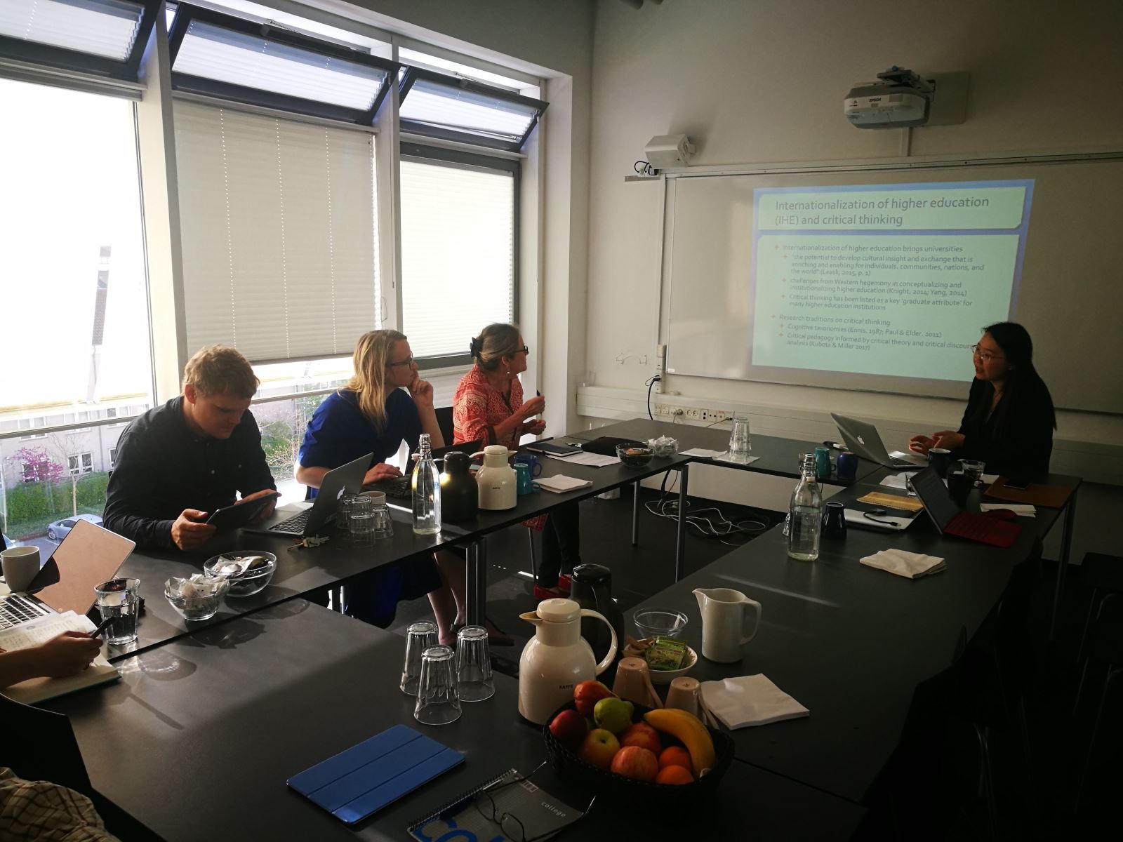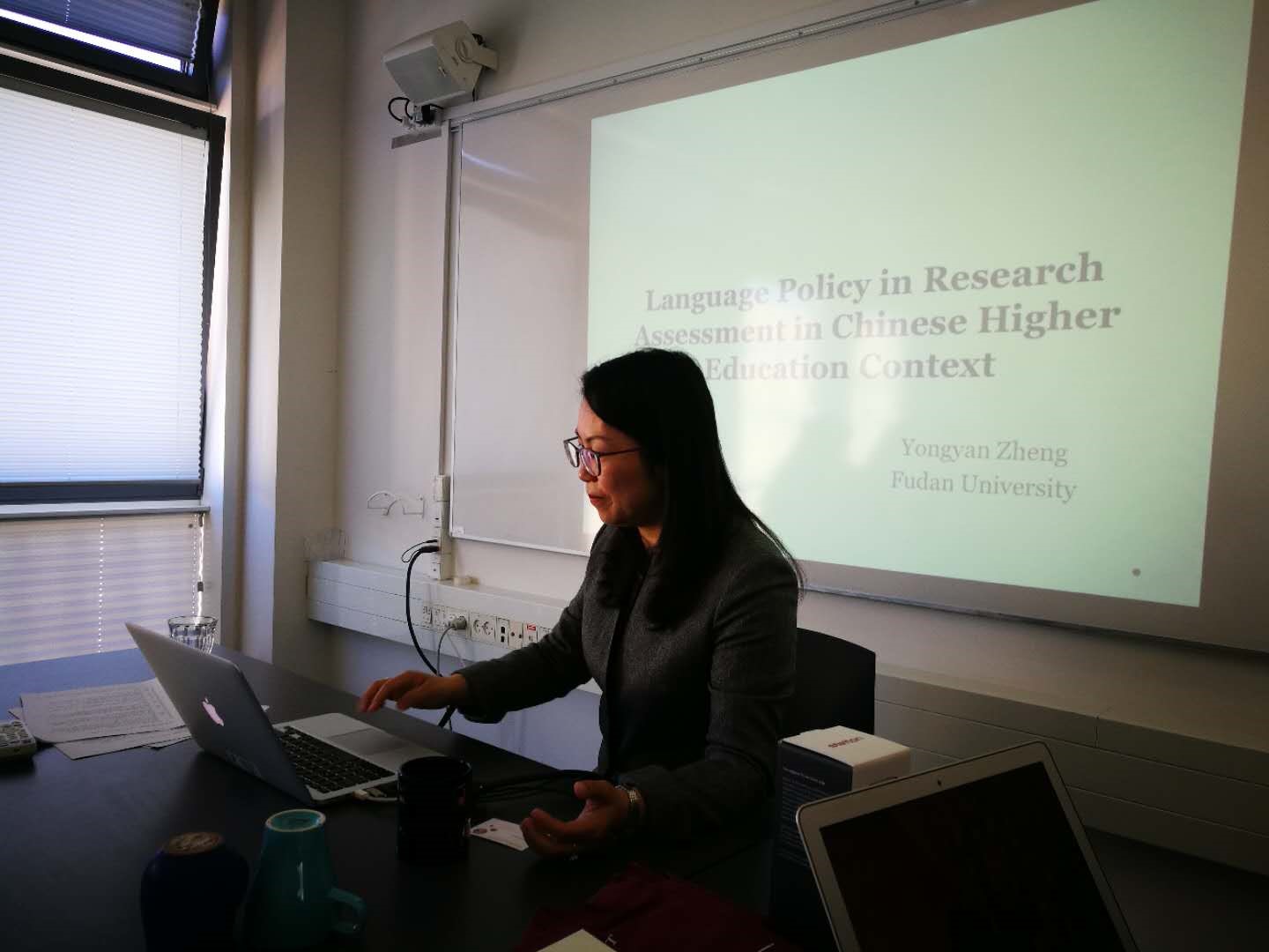 郑咏滟教授首先全面介绍了创新团队的成员、研究课题与先期成果,也同时介绍了无码中文 多语种中心的课程设置、不同语种的选课情况等。哥本哈根大学国际化与平行语言使用中心主任Anne Holmen教授接着介绍了该中心的成员、科研概况和中心在学校发展中的作用。双方就高等教育国际化背景下的多语语言使用与教育政策等议题开展为期两天的学术研讨,并就中丹两国共同面临的多语挑战展开热烈讨论,具体包括英语作为强势学术语言对教师学术发展的影响、国际招生的语言标准和多语工作环境中的语言使用与语言管理等。Anne Holmen教授对我方研究报以浓厚的兴趣,并表达了进一步开展后续交流与合作的意愿。