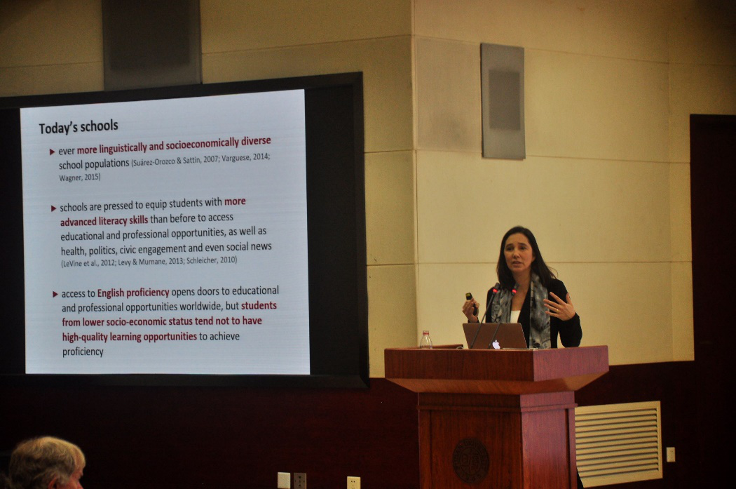 全天六场主旨演讲精彩纷呈。上午第一场主旨演讲由西班牙巴斯克大学的Durk Gorter教授带来,他就如何转变多语课堂中的教师信念从理论和实践两个方面展开讨论。第二场主旨演讲是哈佛大学的Paola Uccelli教授,她系统介绍了她带领的哈佛教育学院研究团队所做的关于青少年核心学术语言能力的系列研究结果,并且讨论了核心学术语言能力在跨语言学习中如何转化。第三场主旨演讲由芬兰赫尔辛基大学的Fred Dervin教授、上海财经大学外语学院的赵珂教授共同主讲。赵珂教授首先介绍了上海财经大学-赫尔辛基大学的跨文化研究中心开展的工作,Fred Dervin教授则从芬兰的多语教育出发,梳理了欧盟多语政策的历史嬗变,指出政策话语与实践之间的差异以及对中国高等教育的启示。