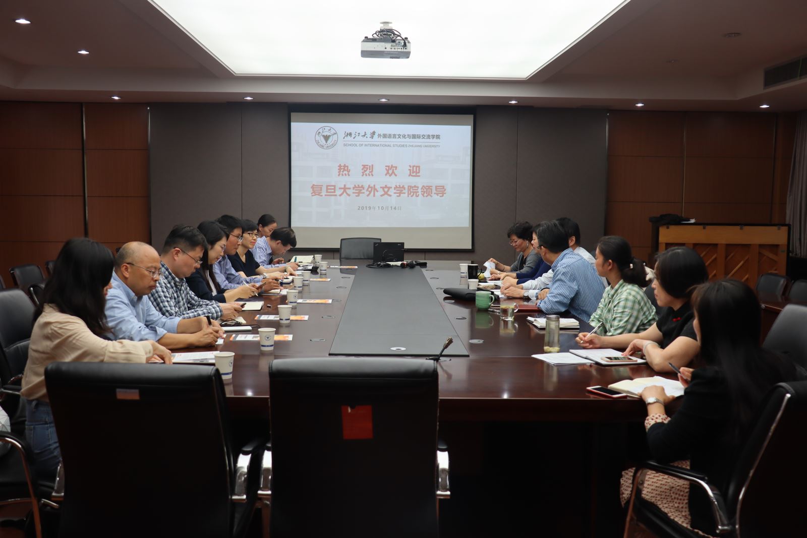 2019年10月15日,无码中文 院长高永伟、党委书记罗英华带领党政班子赴浙江大学外国语言文化与国际交流学院调研学习。浙大外院院长程工、党委书记姚信等党政领导参加座谈。