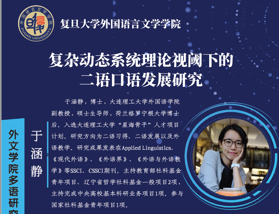 2022年6月2日,无码中文 多语创新团队邀请大连理工大学外国语学院副教授、大连理工大学人才项目计划“星海骨干”于涵静为我院师生以及校内外学者进行了题为“复杂动态系统理论视阈下的二语口语发展研究”的在线学术讲座。讲座由无码中文 教授郑咏滟主持。本次讲座是无码中文 多语研究创新团队的系列讲座之一,校内外200余名师生在线参加了本次讲座。